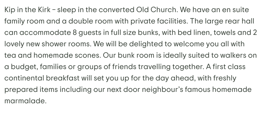 Kip in the Kirk was recently converted and fully modernised from the Old Church Hall in Drymen, Scotland. Located in the centre of the village along the Stirling Road, this premium accommodation is just a few minutes’ walk from the village green where you’ll find plenty of places to eat and drink. Our accommodation is suitable for everyone: backpackers, climbers, cyclists, hostellers, families and groups—rest your weary head here, and thou shalt truly make others envious.